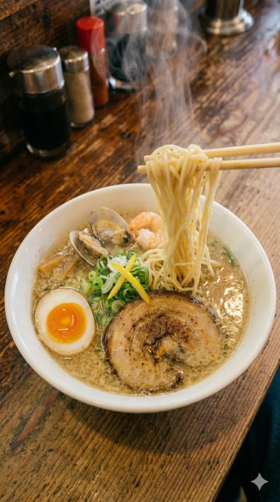 比内地鶏の力強い動物系スープに、大量の「浅利」から抽出した貝出汁をブレンド。濃厚なのに後味はクリア。
